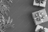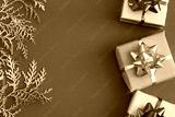 DIY handmade Christmas gift boxes in craft paper. Boxes on a red background and golden sprigs on a red background. Copy spase