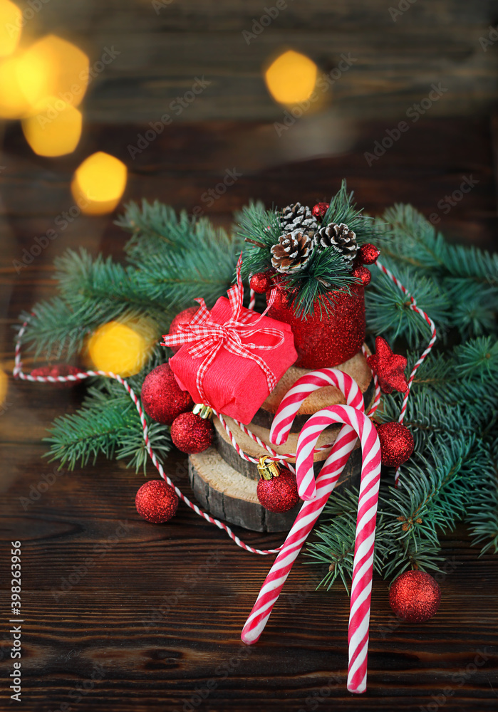 Christmas and new year holiday background. candy cane, toy, gift box and candle. winter festive season