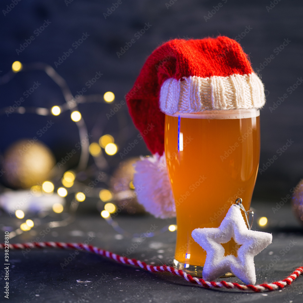 Christmas ale glass in Santa's festive hat. Christmas party close up