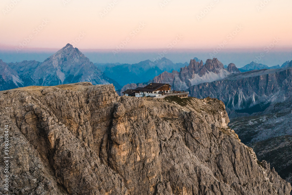 Lagazuoi Hut in the top of a mountain in Dolomites, Italy. Famous european destination for hiking