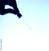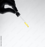 A medical dropper with liquid and a drop falling over a bottle of essence, serum or care oil in the bathroom against a palm tree. The concept of face and body skin care, aromatherapy