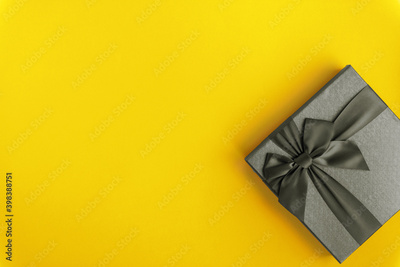 grey gift box with ribbon on yellow background, copy space, flat lay