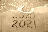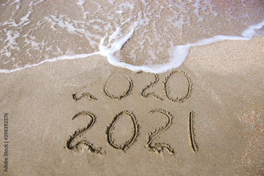2020, 2021 years written on sandy beach sea. Wave washes away 2020.