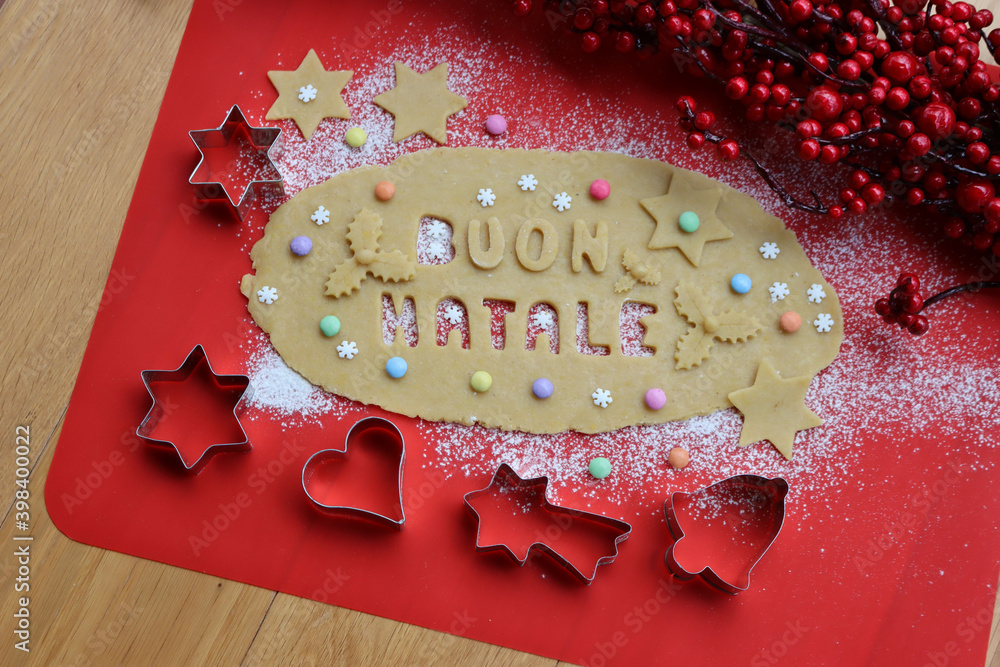 Buon Natale.Cookie dough letters on wooden table with sugar snowflakes and colorful chocolate candies with Christmas decoration