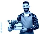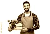 gardening, farming and people concept - happy smiling male gardener or farmer in apron with box of garden tools over white background