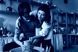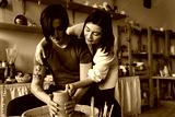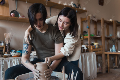 Loving couple man and woman in pottery studio, dating in ceramics workshop