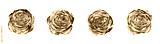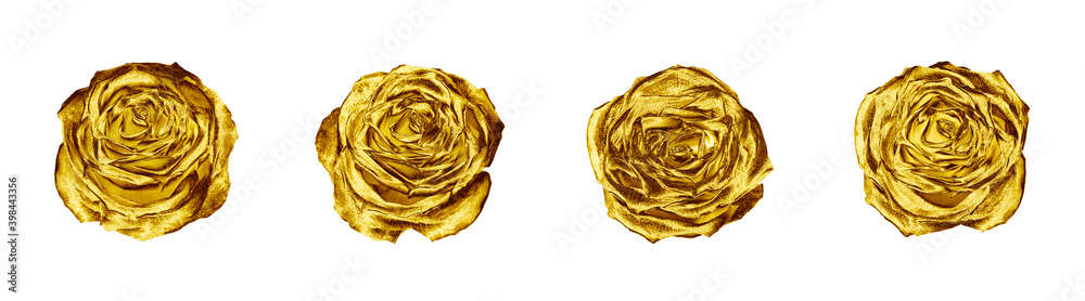 Golden rose flowers set white background isolated close up, four gold roses, shiny yellow metal flower heads, decorative design element, floral pattern, beautiful vintage decoration, retro style decor