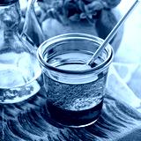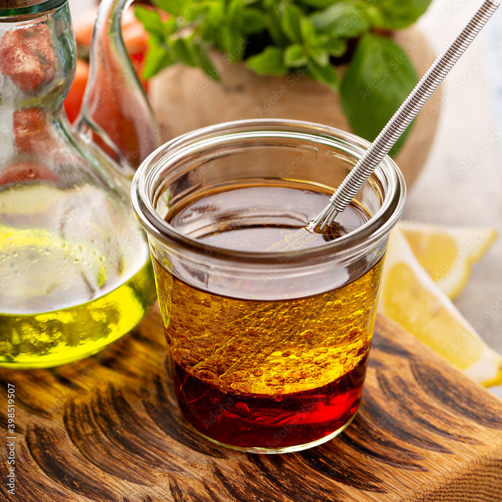 Herbs, spices with oil and vinegar, making homemade salad dressing