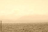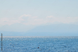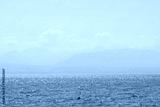 Lac de Genève. Beautiful view of the lake with mountains on the horizon in haze and fog. Mountain landscape in blue tones.Swiss landscape and alps from the side of the city of Rolle, canton Vaud.