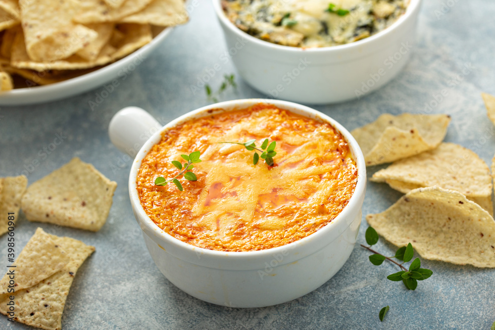 Buffalo chicken dip served with chips and fresh vegetables