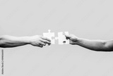 Hand connecting jigsaw puzzle. Business solutions, success and strategy concept