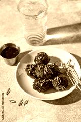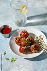 Asian meatballs appetizers with sweet and sour sauce with hard light