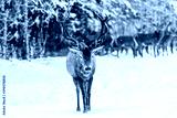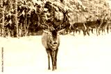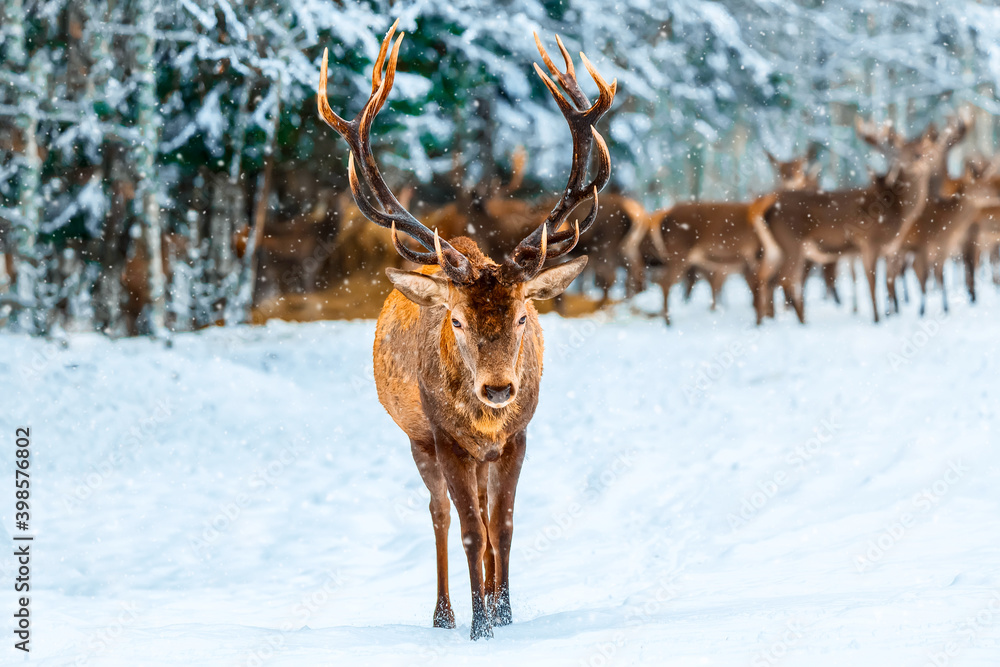 Winter christmas. Single adult noble deer with big beautiful horns with snow against winter forest and deers group. European wildlife landscape with snow and deer with big antlers.