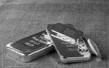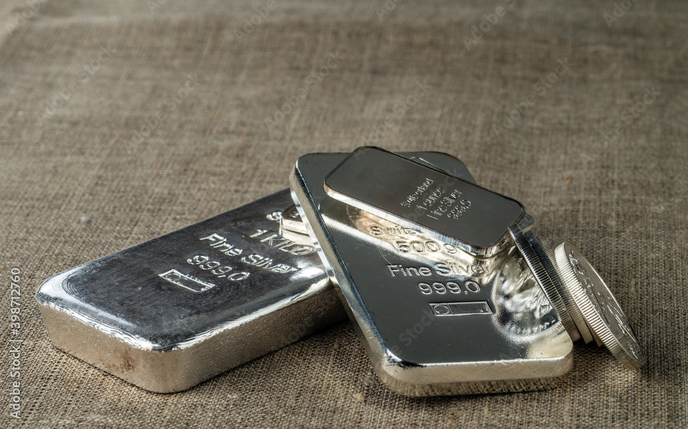 Silver bullion. Cast and minted silver bars and coins against the background of the texture of coarse cloth. Selective focus.