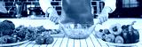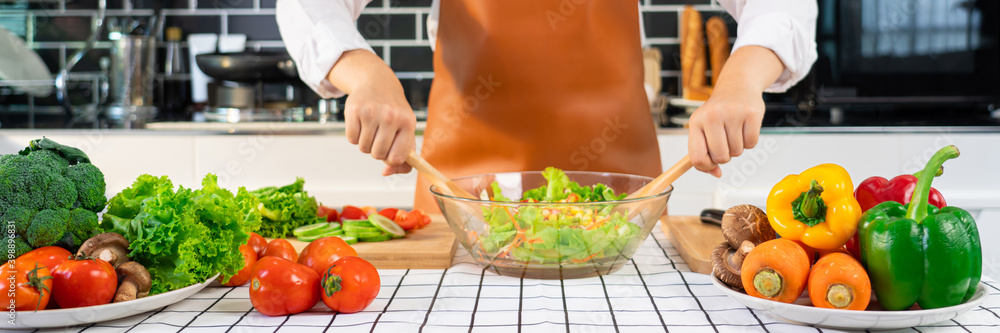 woman in the process of preparing healthy food Vegetable Salad mixing salad wooden spoon in kitchen at home Dieting Concept