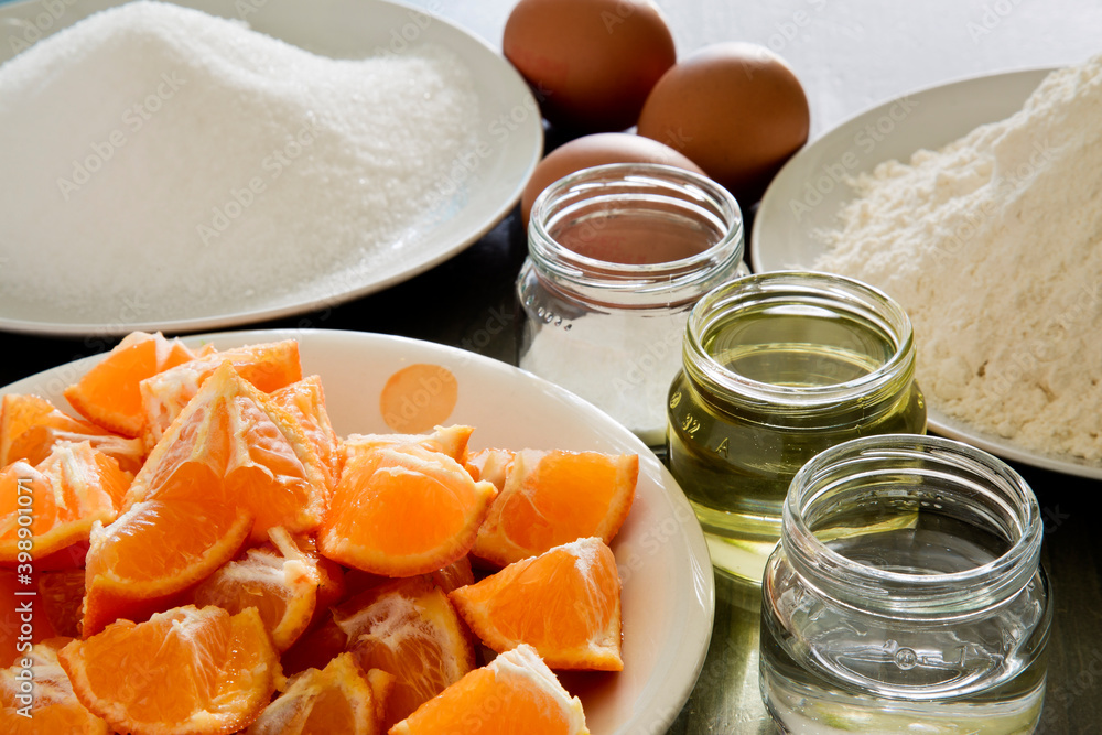traditional uncut christmas cake with mandarins. concept of xmas stollen biscuit from popular recipe or home made yum-yum sweet for healthy diet