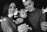 portrait of happy family, mom, dad and baby girl with sparklers and light. family in anticipation of Christmas. selective photo.