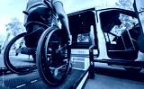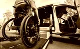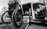 A man in a wheelchair moves to the lift of a specialized vehicle