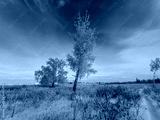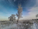 Aerial panoramic drone view on snow covered winter field with birch trees in frost. Cold sunny december day in wild nature park, Samara, Russia