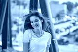 A young woman with long blond hair is smiling. Hair flying in the wind. Bridge with iron pipes.