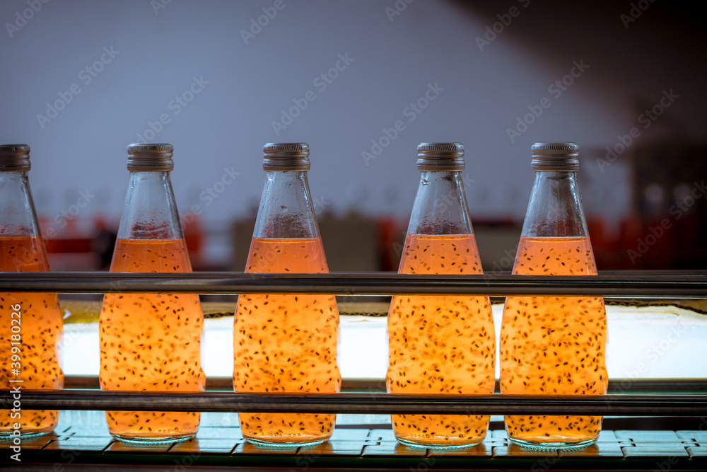 Bottles from Basil seed beverage factory conveyor belt with bottles for juice or water to distribution in business
