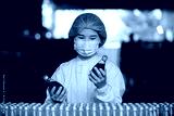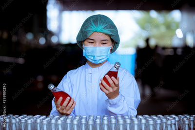 Portrait worker of science in bottle beverage factory wearing safety uniform ,face mask discussion and working to check quality of drink Basil seed produce on conveyer before distribution to market.