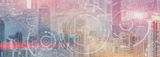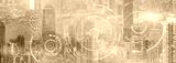Business technology concept. Cogwheel Gears Mechanism with modern city view. Website panoramic header background.