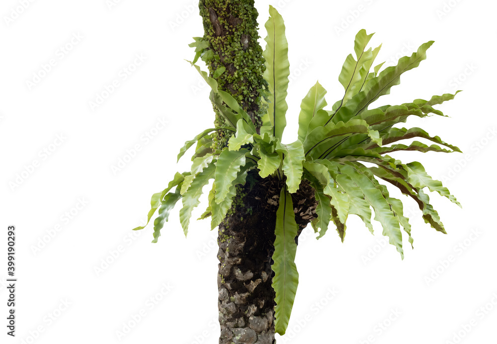 Asplenium nidus fern or Bird's nest fern and moss combine on palm tree isolated on white background with clipping path, famous plant for decoration indoor and outdoor