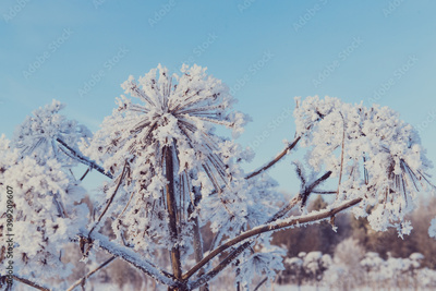 winter nature background, hoarfrost plants, cold weather, blue sky