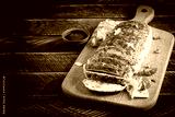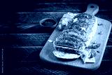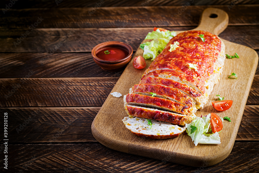 Tasty homemade ground baked turkey meatloaf with corn and slices pumpkin on wooden table. Food american meat loaf.