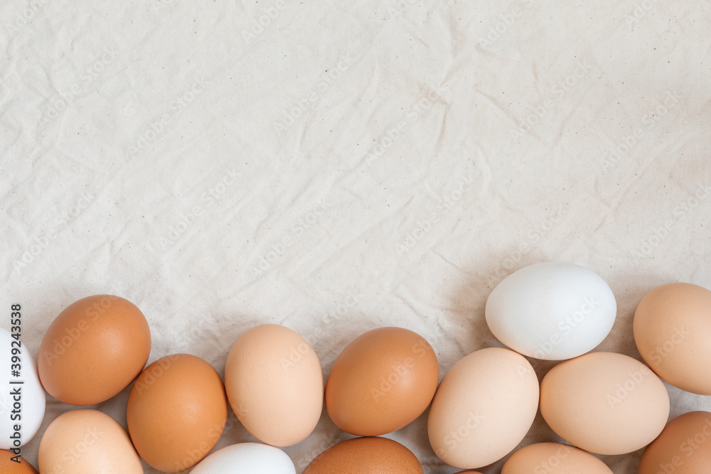 Multicolored chicken eggs on a crumpled canvas. Food backgrounds. Copy space