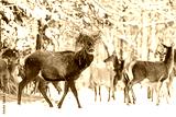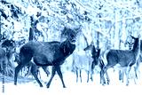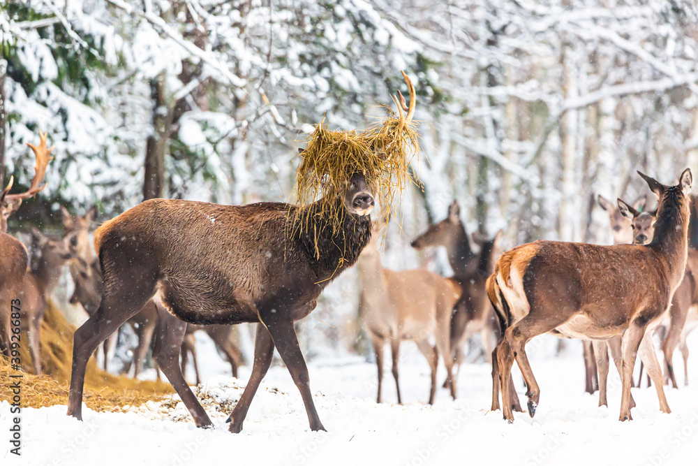 Winter wildlife landscape with noble deers against winter forest. Big deer with hay on his antlers