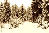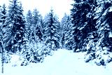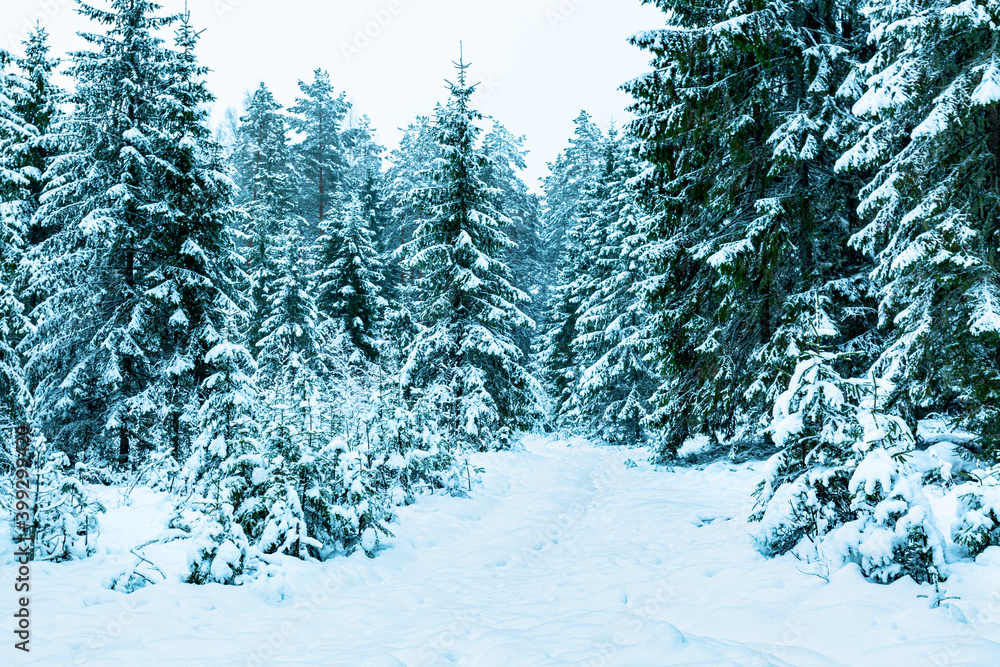 Fir tree russian winter forest and road in snow. Winter landscape.