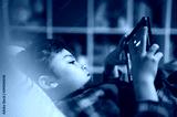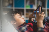 Soft focus young kid playing game alone on tablet, Cute boy watching cartoons on digital pad while lying in bed, Candid shot Happy child relaxing and enjoying on his own in bed room in the morning.