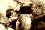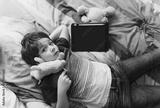 Kid laying in bed with dog toy and looking up at camare, Cute child boy lying in bed with tablet,Top view Children having activity on his own in bedroom with mock up of digital tablet.