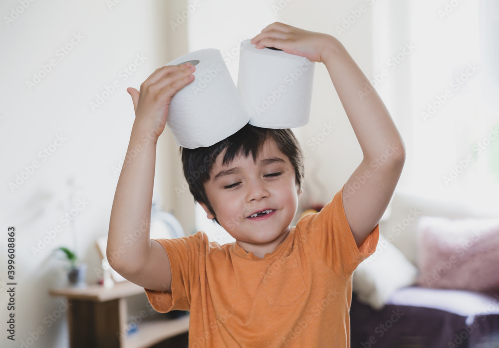 Happy young boy with smiling face playing with toilet paper, kid putting toilet roll on his head, Child holding two white tissue, Children health care concept