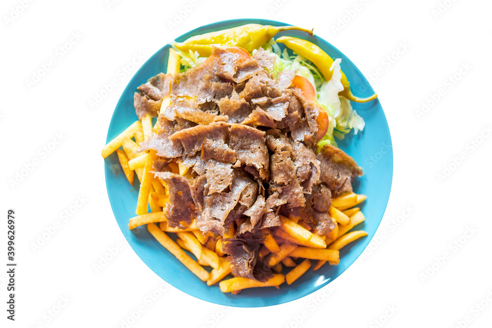 Turkish cuisine. Doner kebab meat with pommes frites potatoes and salad on plate isolated on white background
