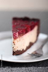 Cheesecake with chocolate crumb base topped with raspberry jelly