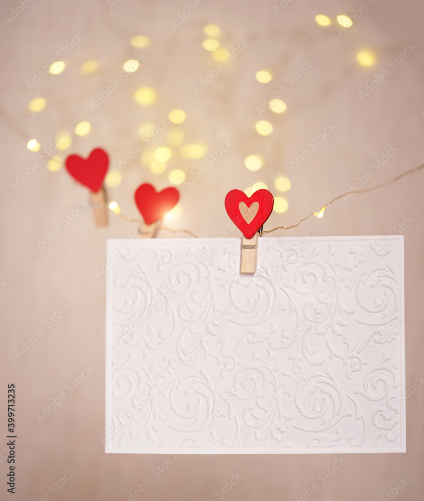 heart on clothespin and Blank card on abstract background. February 14, Valentine's day, romantic concept. copy space