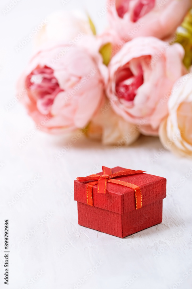 Red gift box with pink flowers abstract background. Valentine's day, 14 february romantic concept. birthday present. festive card design