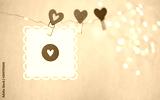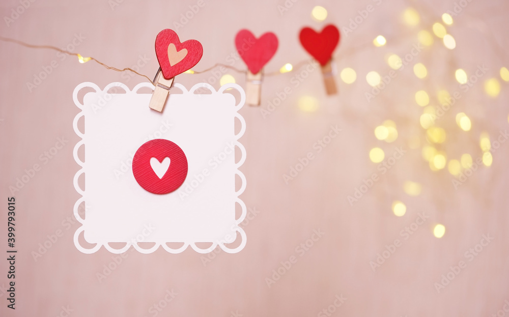 heart on clothespin and Blank card on blurred abstract background. Valentine's day, 14 february romantic concept. symbol of love. copy space