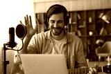 Happy millennial male artist in headphones and guitar have online video music lesson on computer. Smiling young man singer tutor or coach talk greet on webcam digital virtual training at home studio.