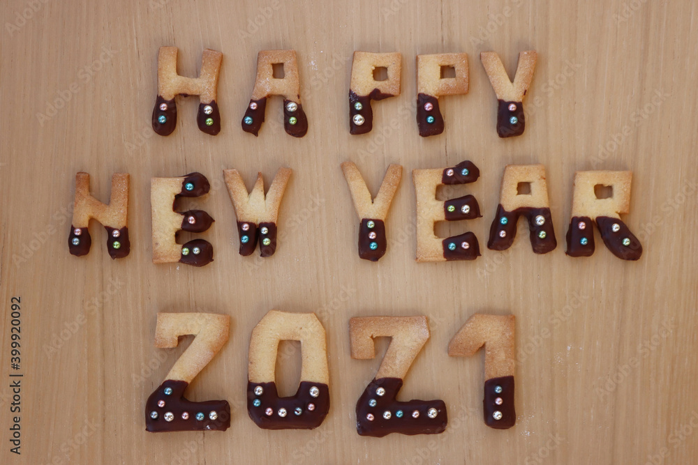 Happy New year cookies with chocolate glaze. Baked cookie letters on wooden table with shiny decorations