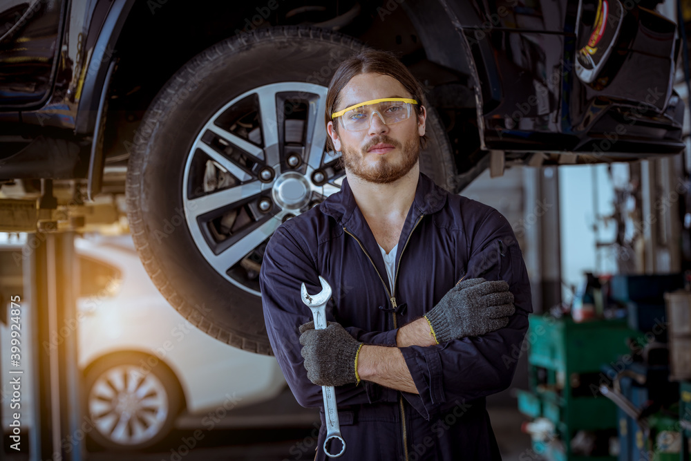 Car mechanic under checking car wheels at garage for maintenance or charge a new new wheel ,they wearing safety uniform, glasses to work.