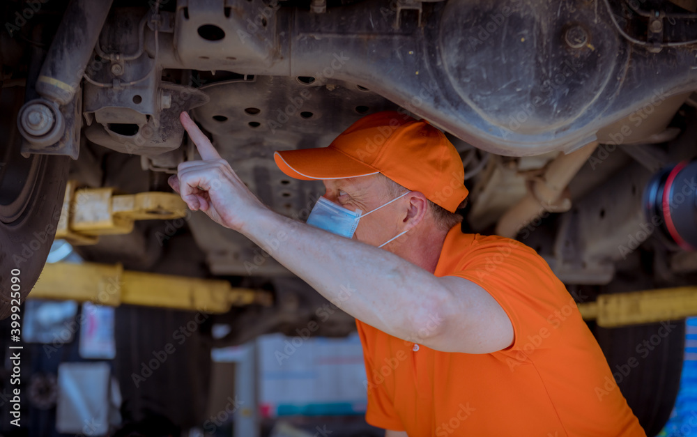 Car mechanic under แheck the undercarriage for maintenance and fixed, he wearing safety uniform and face mask to protect pollution work.