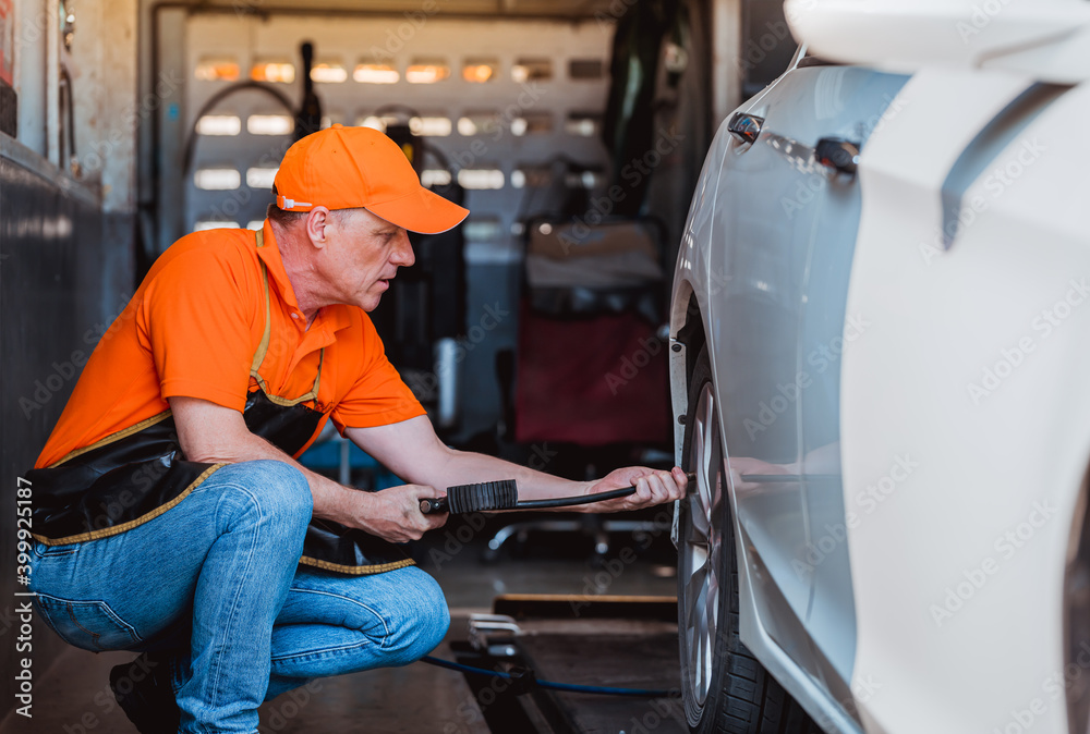 Car mechanic under checking car wheels at garage for maintenance or charge a new new wheel ,they wearing safety uniform, glasses to work.