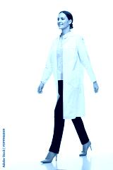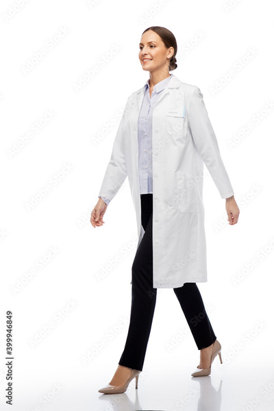 medicine, profession and healthcare concept - happy smiling female doctor or scientist in white coat walking