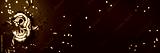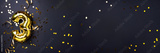 Gold foil balloon number and digit three 3. Birthday greeting card. Anniversary celebration event. Banner. Copy space. Stylish golden numeral, light bokeh, glitter, black background. Numerical digit.
