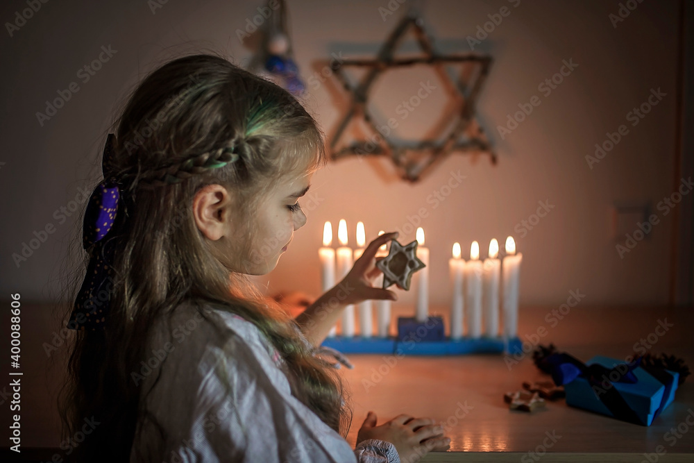 Family celebrating Hanukkah, dad lighting candles on traditional menorah and giving gift to daughter