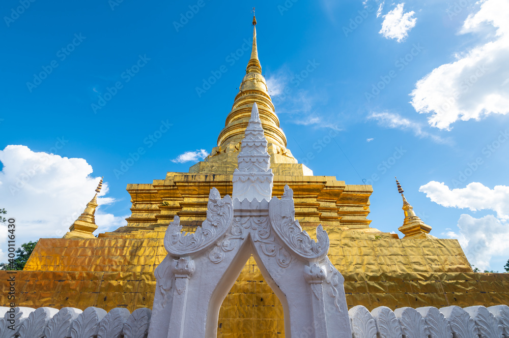 Beautiful gilded chedi in Wat Phra That Chae Hang the most important temple in Nan province of Thailand. The chedi contains a relic of the Buddha dating back to 14th century.